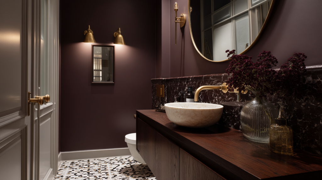 Kleine Räume, große Wirkung. Das Gäste-WC ist der perfekte Ort, um mutig zu sein. Niemand wohnt hier – es ist ein reiner Funktionsraum. Hier darfst du überraschen. Aubergine an den Wänden, dazu eine gemusterte Fliese und goldene Armaturen – dein Gäste-WC wird zur Schmuckschatulle. Ein unerwartetes Wow-Erlebnis, das deine Gäste zum Lächeln bringt und zeigt: Hier hat sich jemand wirklich Gedanken gemacht.