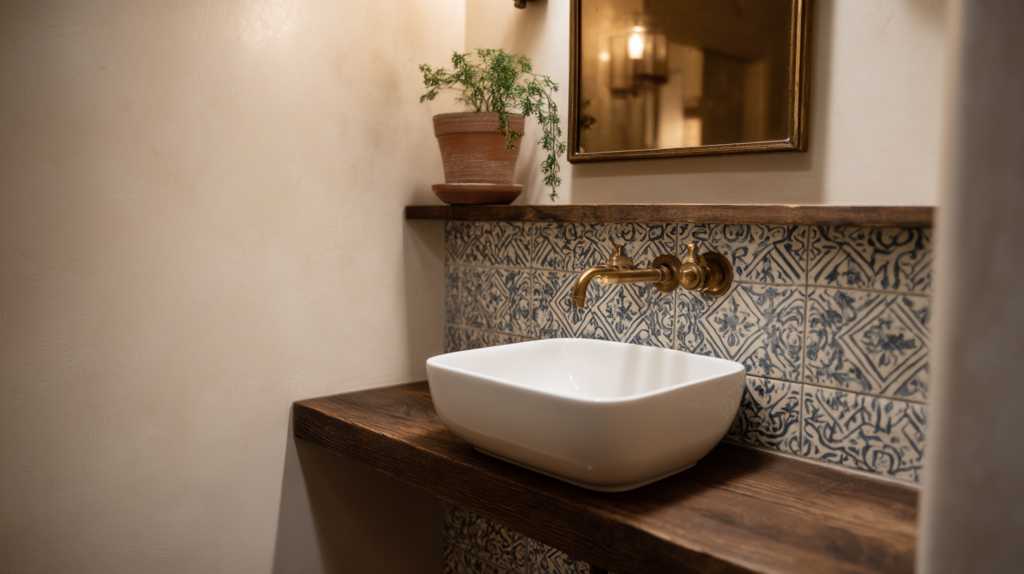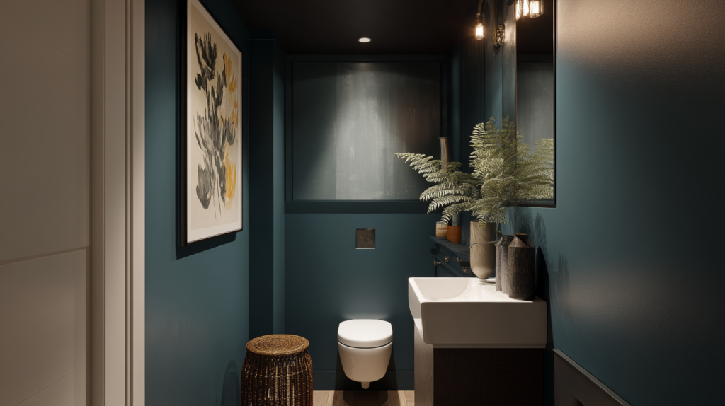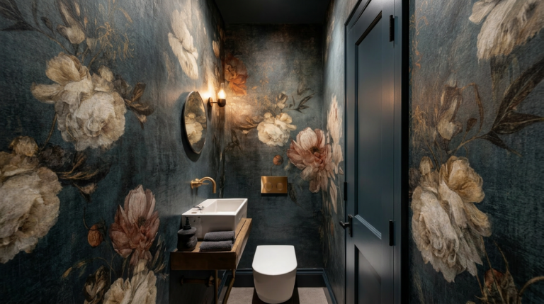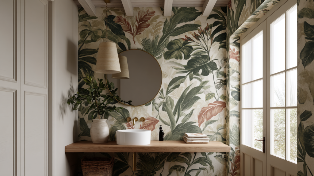 Im Gäste-WC funktioniert das besonders gut, weil der Raum klein genug ist – die Tapete überwältigt nicht, sie rahmt ein.