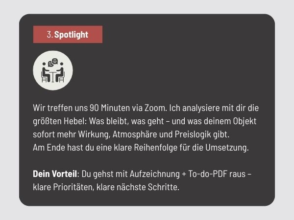 Spotlight ist ideal für Ferienwohnungen und kleine Hotels– oder für größere Objekte, wenn du einen klaren Fokus setzt. In 90 Minuten erarbeiten wir keine Komplettplanung fürs ganze Haus, sondern die entscheidenden Stellschrauben und eine Reihenfolge, die dich sofort voranbringt.